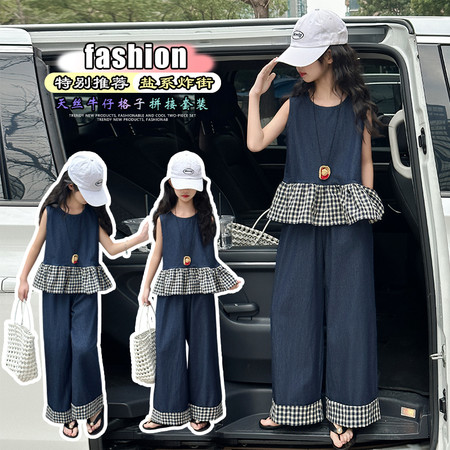 1*5收藏“605格子拼天丝牛仔套装”
